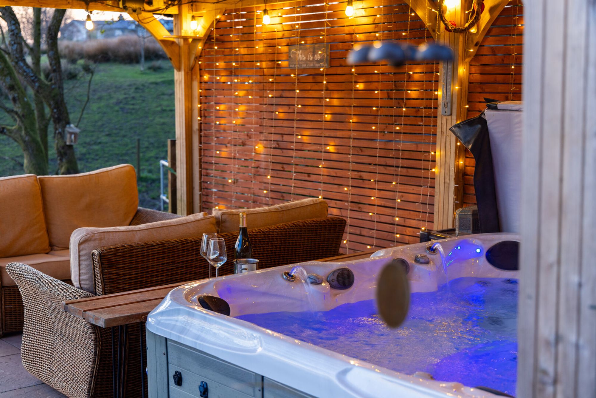Double doors from the conservatory open to a wrap-around terrace ending in a huge, partly enclosed pergola with a wooden roof and exterior lighting. This is where you will spend many summer evenings, soaking in the hot tub with a glass of wine or hanging out with friends and family in the seating area while watching the spectacular sunsets and the ducks on the pond.